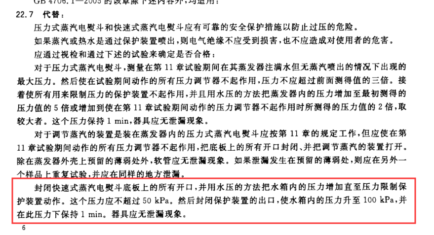 (1)對于壓力式蒸汽電熨斗,測量在第11章試驗期間在其蒸發器注滿水但無蒸汽噴出的情況下出現的壓力。然后使在試驗期間動作的所有壓力調節器不起作用,并再次測量壓力。壓力不應上升到大于200 kPa(2bars)。接著使所有用來限制壓力的保護裝置不起作用,并且用水壓的方法把蒸發器內的壓力增加至最初測得的壓力值的5倍或增加到使在第11章試驗期間動作的壓力調節器不起作用時所測得的壓力值的2倍,取較大者水箱應無泄漏現象。