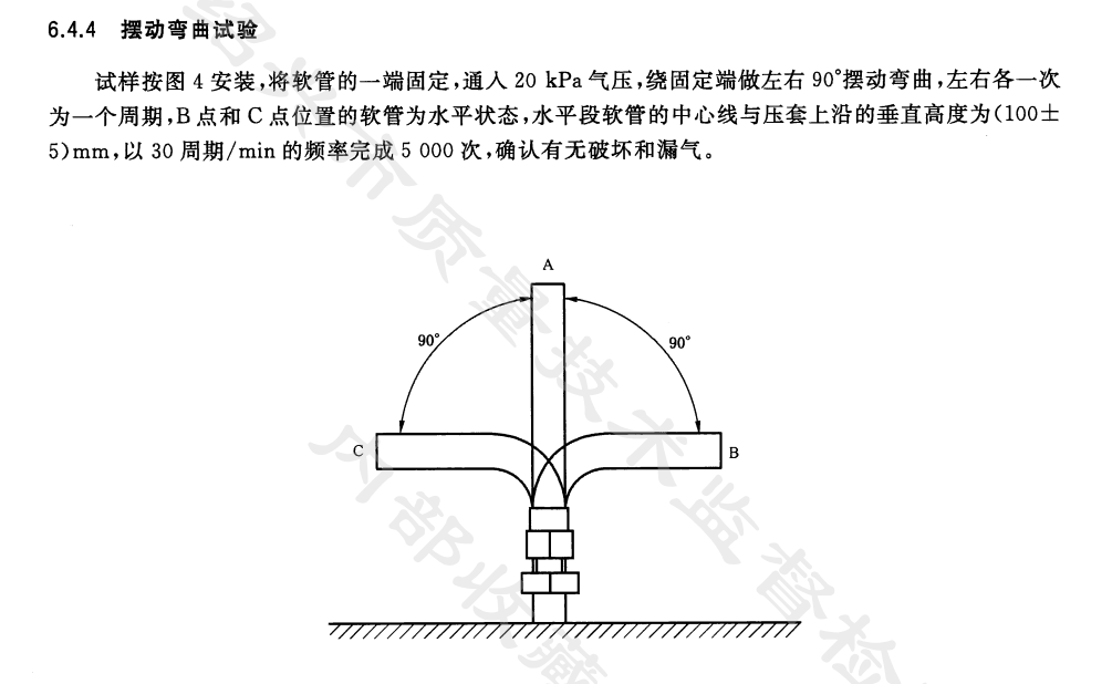 燃氣灶具連接軟管擺動彎曲試驗機適用于燃氣用具產品連接用金屬包裹軟管的耐彎曲和扭曲試驗,按標準要求所示取1000mm的試樣軟管,在通入20Kpa的空氣壓力狀態下,一端固定于實驗臺上,在100mm±5mm處呈90°彎曲,另一端與固定手柄連接且密封,用手柄使軟管繞軸線旋轉,A-B-A,A-C-A二次為一個周期,扭動周期為30周期/min,扭轉周期為5000個周期,觀察波紋管有無裂痕和漏氣,防護套有無裂痕。