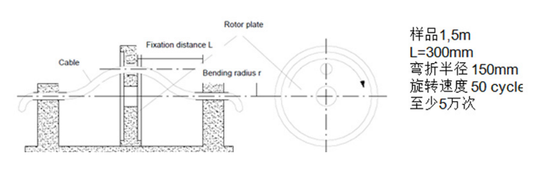 這項測試中電纜兩端固定,中間部分做離心旋轉運動。