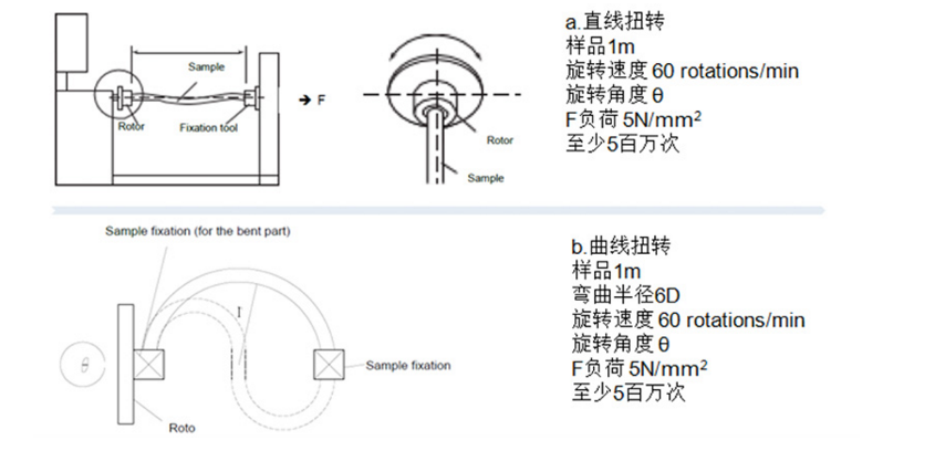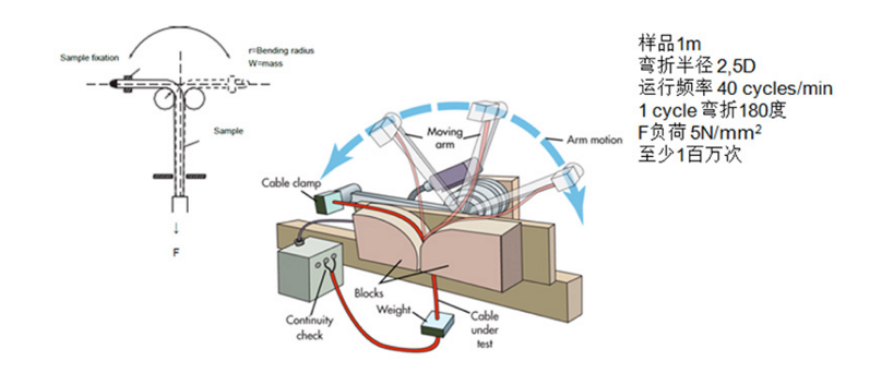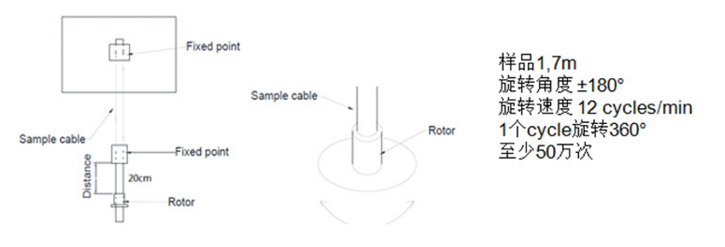 測試時,電纜自由鍛在180度范圍內左右搖擺,每分鐘40次的旋轉率,總次數要求是100萬次。因為每次彎折的點是在兩個固定件間的位置,并且反復在一個點上進行操作,所以這項測試要求比較苛刻。