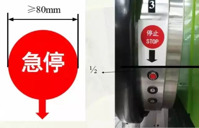 2.15 緊急停止裝置 B | (1)緊急停止裝置應(yīng)當(dāng)設(shè)置在自動扶梯或者自動人行道出入口附近、明顯并且易于接近的位置。緊急停止裝置應(yīng)當(dāng)為紅色,有清晰的永久性中文標(biāo)識;如果緊急停止裝置位于扶手裝置高度的1/2以下,應(yīng)當(dāng)在扶手裝置1/2高度以上的醒目位置張貼直徑至少為80mm的紅底白字“急停”指示標(biāo)記,箭頭指向緊急停止裝置; |