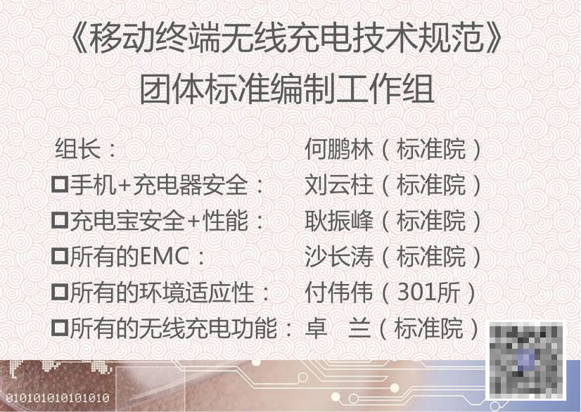 此次會議正式成立了中國通信工業協會團體標準《移動終端無線充電技術規范》編制工作組;討論通過了《移動終端無線充電技術規范》制定原則及框架結構,初步確定標準將分為發射端、接收端、帶無線充電功能的移動電源三個部分;明確了《移動終端無線充電技術規范》的三個部分標準的具體分工,并初步討論了三個部分的內容框架;明確了標準的的編制計劃。