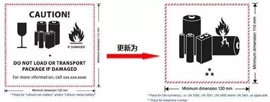 變更一:更新鋰電池標(biāo)簽,新標(biāo)簽將于2019年1月1日強(qiáng)制實(shí)施(標(biāo)簽中的UN及其代碼高度不得低于12mm)。