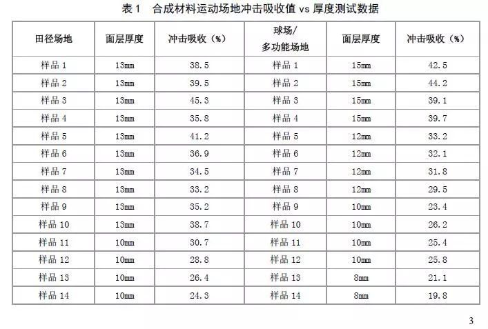 在具有同樣材料組成的前提下,合成材料面層運動場地的安全保護性能(沖擊吸收值)與厚度有著近似正比的關系(見表1)。