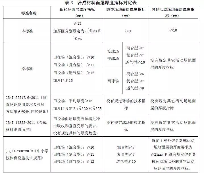 (3) 本標準中合成材料面層厚度指標同其它國內相關標準的對比如表3所示。