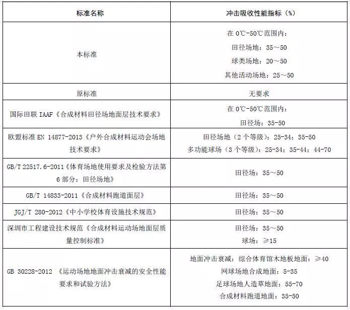 原標準中規定的邵氏硬度、壓縮復原率、回彈值,鑒于目前國際、國內相關標準已不再將其作為運動面層物理性能指標,因此在本標準中予以刪除。