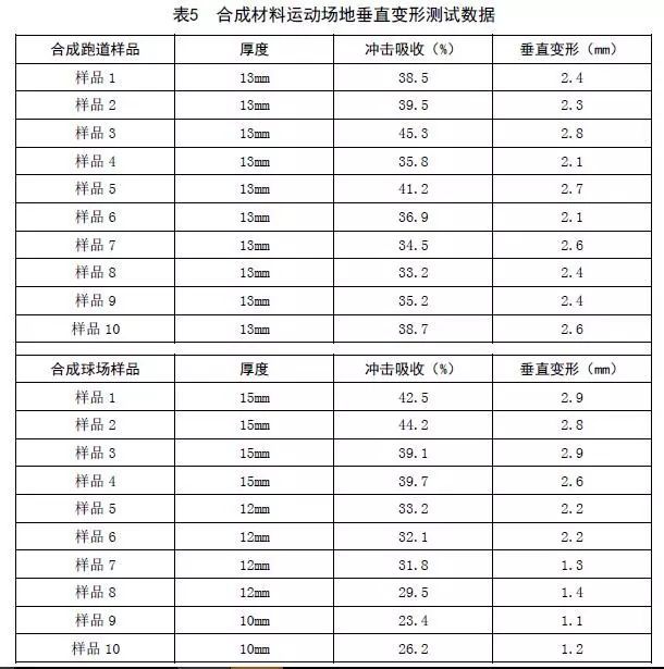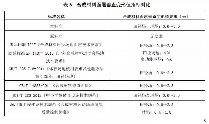 (2)表6是本標準中合成材料面層垂直變形值同其它國內外相關標準的對比。