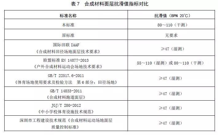 (2)表7是本標準中合成材料面層抗滑值同其它國內外相關標準的對比。