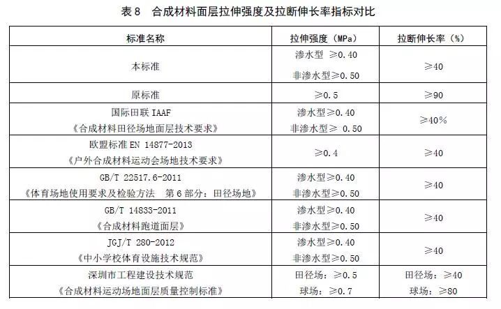 (2)表8是修訂后合成材料面層的拉伸強度及拉斷伸長率同國內外相關標準的對比。