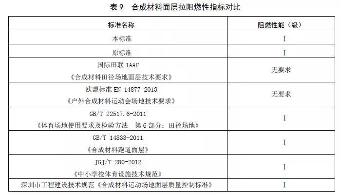 (2)表9是本標準合成材料面層的阻燃性指標同國內外相關標準的對比。
