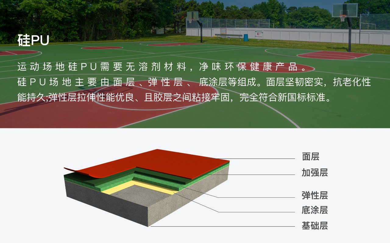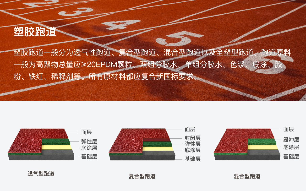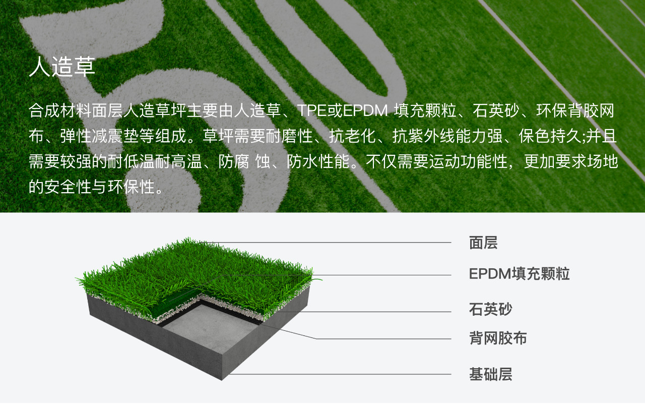 運動場地合成材料面層指用高分子合成材料鋪裝的運動場地面層,包括塑膠跑道、籃排球運動場和人造草皮等,一般由聚氨酯膠水、聚氨酯色漿、EPDM 顆粒、ETPU 顆粒、SBR顆粒等組成。