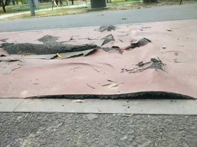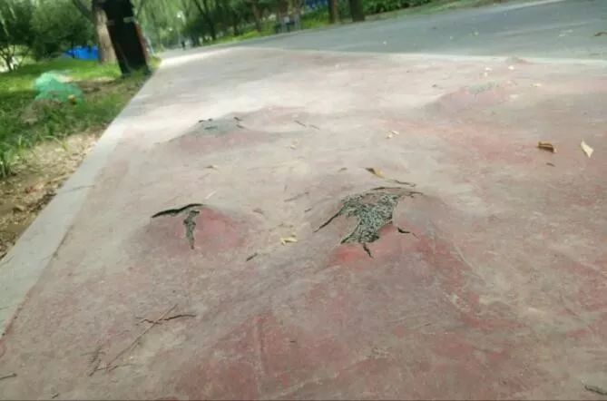 近日,記者來到海淀公園發(fā)現(xiàn),僅在智能步道前 200 米的路段上,就有十幾處破損、鼓包,多數(shù)都是巴掌大小,受損最嚴重的“傷口”超過 50 厘米長、20 厘米寬。“傷口”處的塑膠顆粒散落,或是整塊卷起甚至剝離。