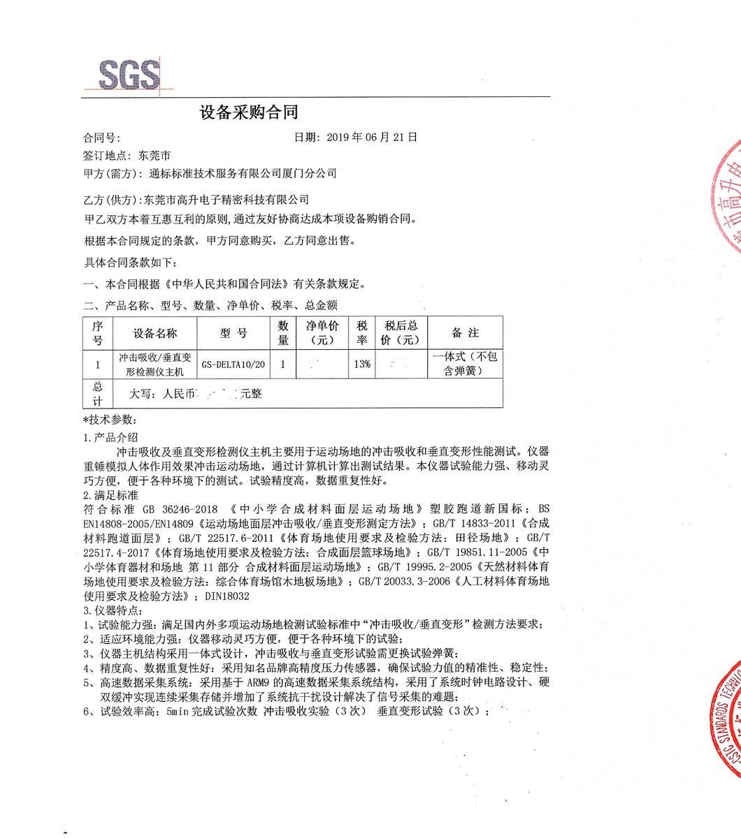 自2018年10月與上海(必維)國際集團檢測有限公司(法國BV實驗室)完美合作之后,Delta德爾塔儀器在塑膠跑道運動場地材料領域新增另一家重量級跨國第三方檢測機構客戶:通標標準技術服務有限公司廈門分公司,SGS廈門分公司材料實驗室于近期擴項了塑膠跑道新國標GB36246-2018全項目檢測能力。廈門SGS分公司經過多輪對供應商嚴格篩選、考察比較、實驗數據比對,最后排除進口5A、3A、2A等同類儀器,選擇我司最新便攜式“DELTA10/20型沖擊吸收與垂直變形檢測儀”,我們在此對客戶的信任和支持表示衷心的感謝, 我們將以最優良的產品和最優質的售后服務回報客戶!
