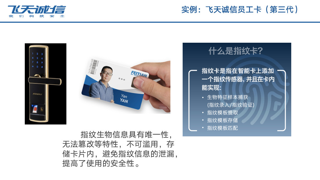 仇南杰還展示了公司員工卡的兩次升級,從普通的M1卡到帶有動態密碼模塊,再到整合了指紋模塊的指紋卡,必須經過本人的指紋驗證才能刷卡進行下一步操作,是目前IC卡領域先進技術的代表。