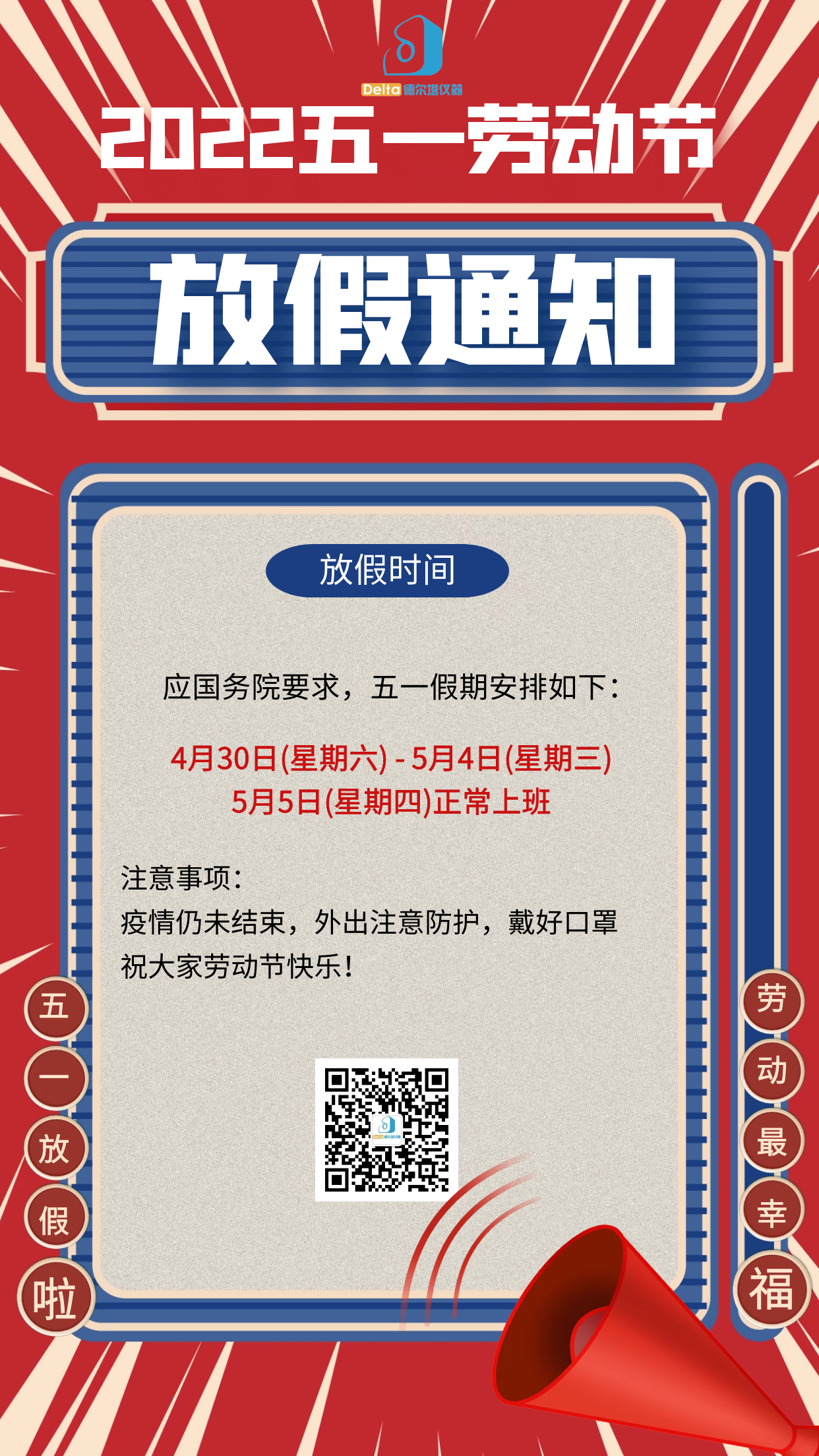 Delta德爾塔儀器應(yīng)國(guó)務(wù)院要求,五一假期安排如下:4月30日(星期六) - 5月4日(星期三),5月5日(星期四)正常上班。疫情仍未結(jié)束,外出注意防護(hù),戴好口罩。祝大家勞動(dòng)節(jié)快樂!