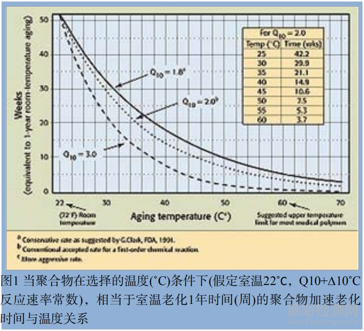 一個給定的聚合物具有以各種方式 ( 晶體、玻璃、不定形等 ) 組成的許多化學功能基團,并含有添加劑如抗氧化劑、無機充填劑、色素和加工助劑。所有這些變量的總和結合產品使用和儲存條件變量決定了材料的化學性能的退行性變。值得慶幸的是,生產醫療器械的大部分都是采用常用的幾種高分子材料,這些材料已經廣泛使用并且都進行了良好的表征。根據以碰撞理論為基礎的阿列紐斯(Arrhenius) 模型建立的加速老化簡化實驗方案 (Simplified Protocol for AcceleratedAging),也稱“10 度原則”(10-degree rule),可在中度溫度范圍內適用于良好表征的聚合物,試驗結果可以在要求的準確度范圍內。