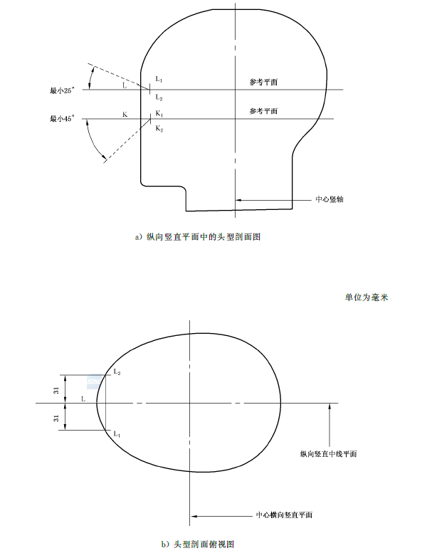 b) 上視野:兩面角由頭型參考平面和其向上形成角度不小于25°的平面組成,其邊是直線l1l2=31+31=62(mm)。如下圖所示;