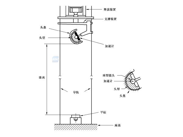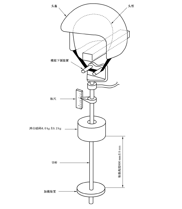 c) 沖擊砝碼應從175mm±5mm的高處釋放,沿引導裝置的導軌自由墜落,每頂頭盔沖擊一次,頭盔應不從頭型上脫落。