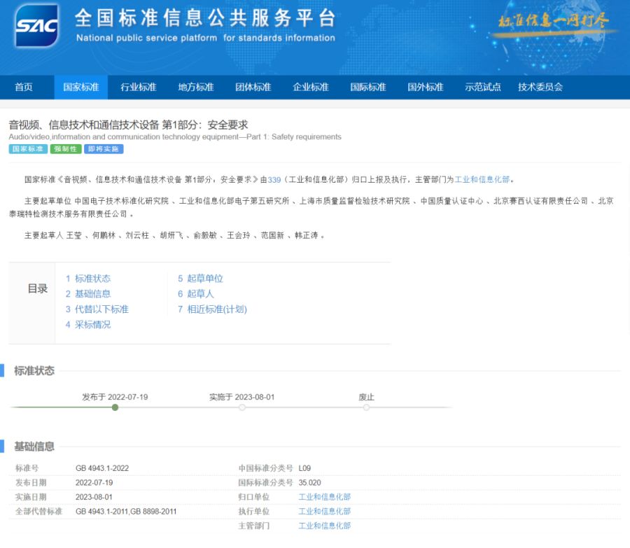 和現行國家標準相比,新版GB 4943國家標準將代替以前的GB 4943.1-2011《信息技術設備 安全 第1部分:通用要求》和GB 8898-2011《音頻、視頻及類似電子設備 安全要求》兩項強制性國家標準。相比于之前的標準,新標準主要有以下差異。