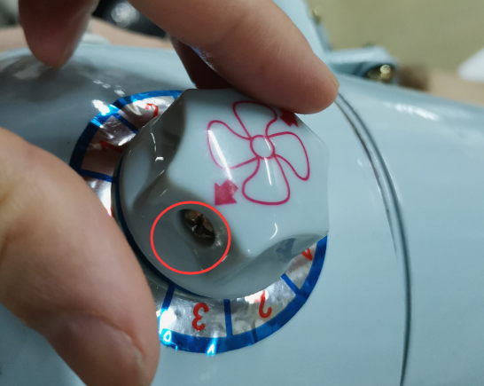 某便攜式電風扇,塑料旋鈕上有一顆接地金屬固定螺釘銷釘,人手操作時可以摸到,如圖1和圖2所示。