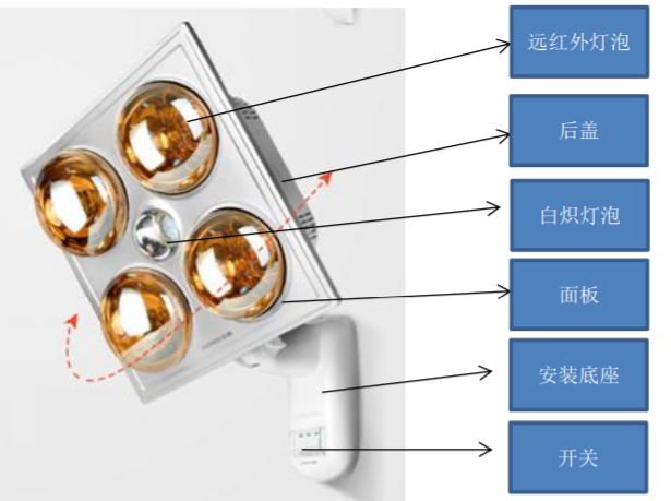 觀點2:燈暖浴霸不是標準定義的“可見發光的輻射式加熱器”,所以22.107條款“不能改變輻射方向”的要求不適用于如圖所示的產品。