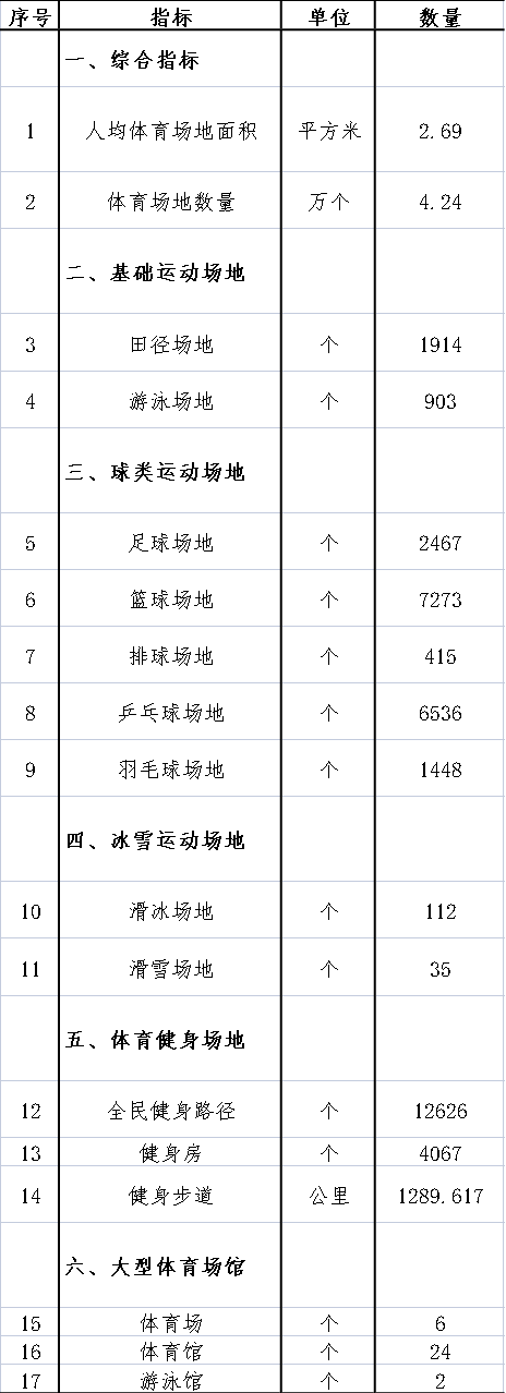 從具體數據來看,田徑場地1914個,游泳場地903個;足球場地2467個,籃球場地7273個,排球場地415個,乒乓球場地6536個,羽毛球場地1448個;滑冰場地112個,滑雪場地35個;全民健身路徑12626個,健身房4067個,健身步道1289.617公里;體育場6個,體育館24個,游泳館2個。