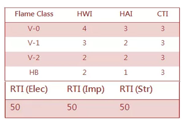 UL 2238: 對塑料的Flame Class, HWI, HAI, CTI 等都有要求,如下表所示是不同F(xiàn)lame Class對應(yīng)HWI, HAI, CTI的最小值要求: