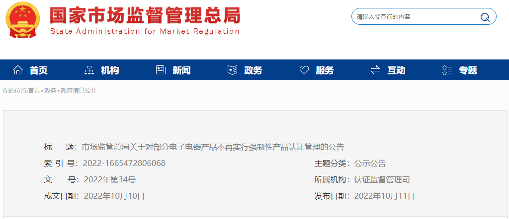 貫徹落實《國務院辦公廳關于深化電子電器行業管理制度改革的意見》(國辦發〔2022〕31號)精神,市場監管總局按照必要性和最小化原則對強制性產品認證(以下稱CCC認證)目錄進行了調整?,F將有關事項公告如下: