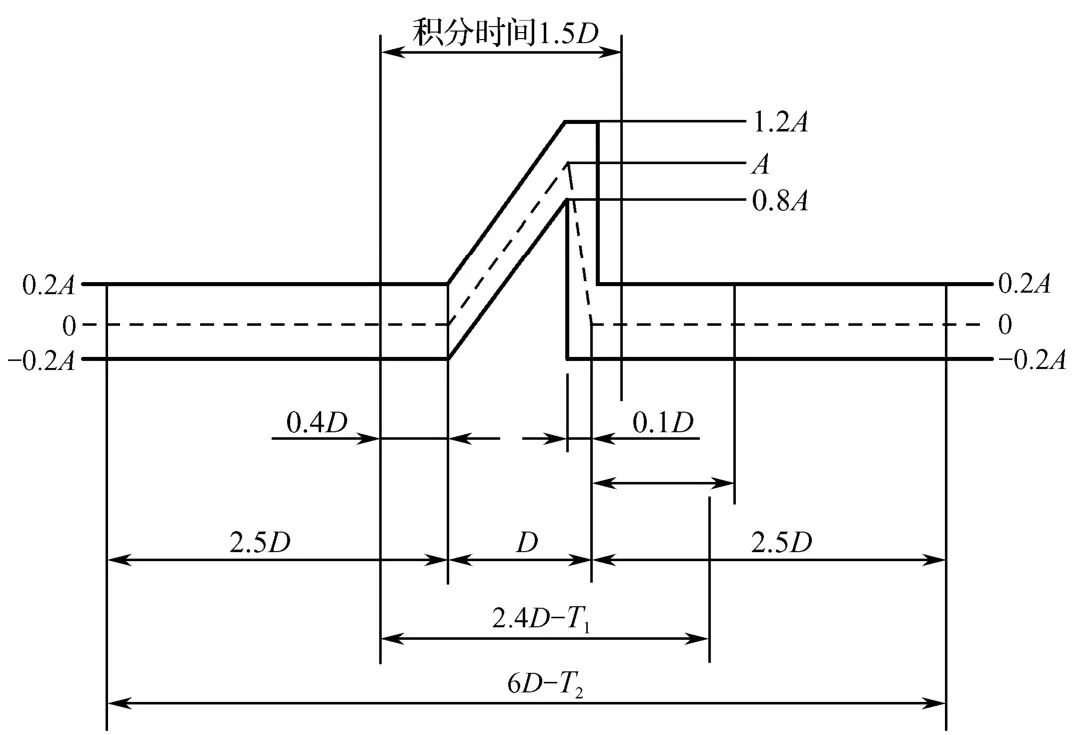 注:--為標稱脈沖線;—為容差范圍線;D—標稱脈沖的持續時間;A—標稱脈沖的峰值加速度T1—用常規沖擊機產生沖擊時,對脈沖進行監測的最短時間;T2—用電動振動臺產生沖擊時,對脈沖進行監測的最短時間