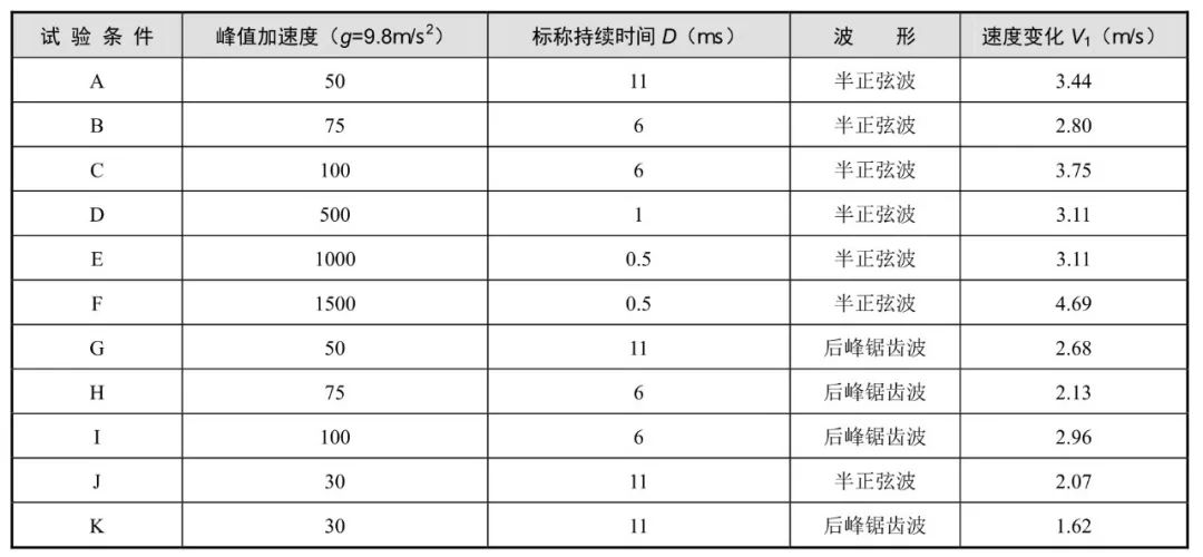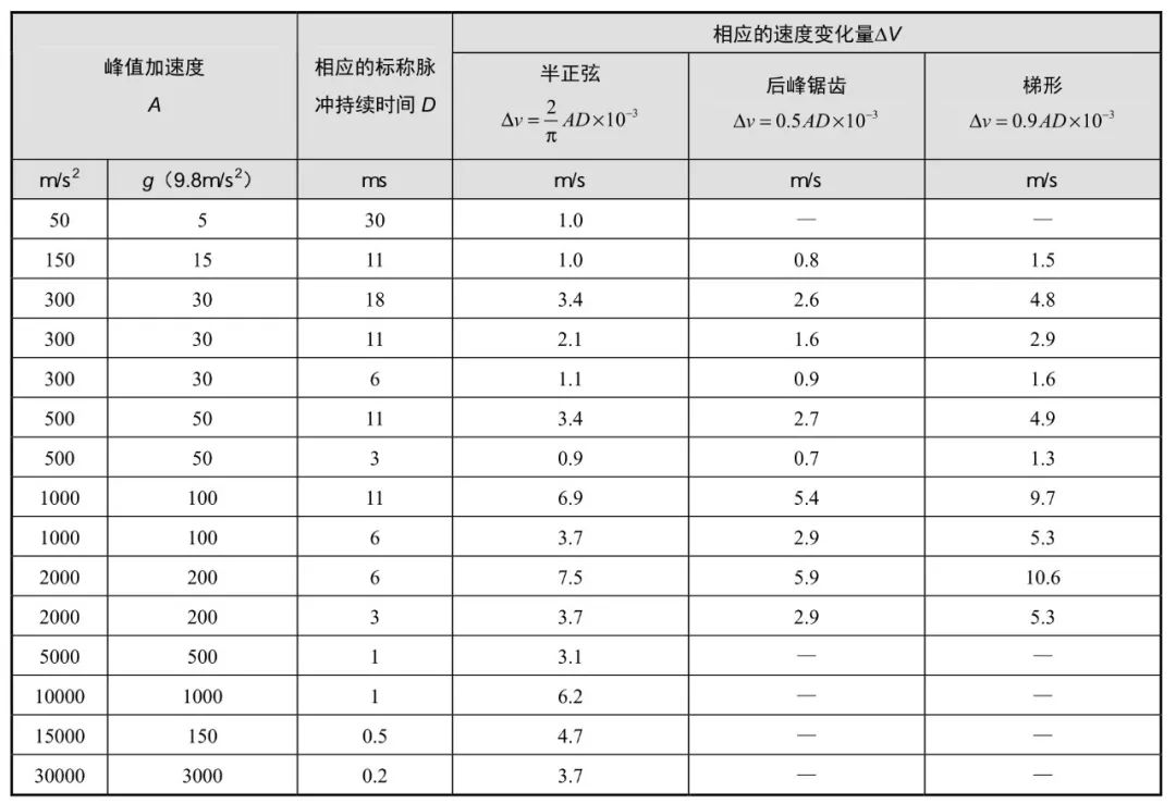 GB/T 2423.5—1995 中給出了脈沖波形和試驗嚴酷等級,試驗時可選用其中的一種脈沖波形和表 1給定的一種嚴酷等級和相應的速度變化量。
