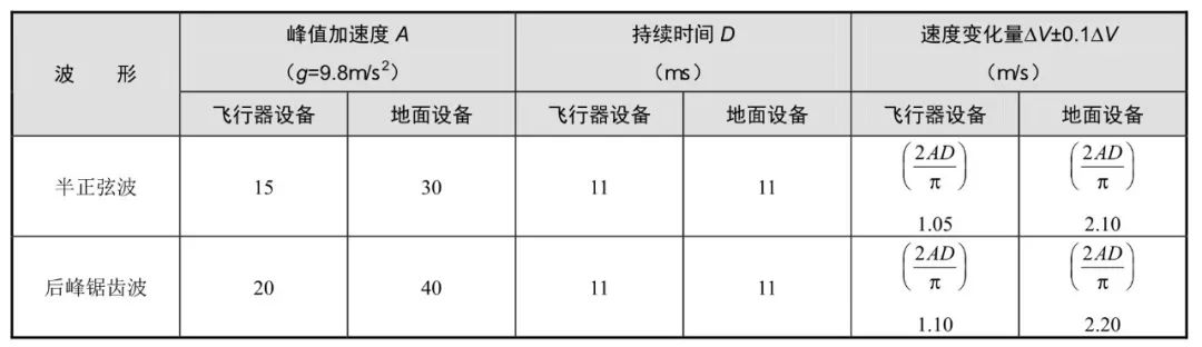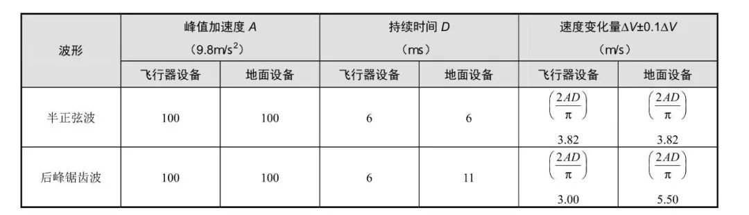 注:① 速度變化量由沖擊脈沖波形積分求得。積分時間從脈沖前0.4D到脈沖后0.1D止,D為沖擊脈沖持續時間。② 裝在減震器上質量小于150kg的飛機設備應優先選用后峰鋸齒波。