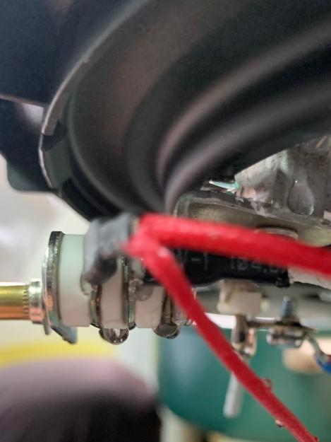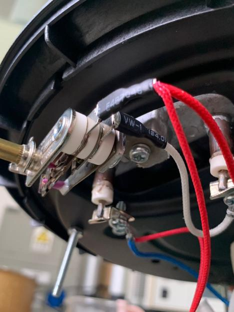 與1min內(nèi)持續(xù)注入器具的試驗相比,10 s內(nèi)將等量的水溶液持續(xù)地注入器具,由于流量是前者的6倍,溢出的水就會從器具邊緣傾瀉而下,如圖4所示,使得更多的水可以進入到器具內(nèi)部。在本試驗中更直接導(dǎo)致該樣品在經(jīng)受16.3的電氣強度試驗時基本絕緣被擊穿,器具內(nèi)部的可調(diào)式溫控器甚至被濺入的水弄“失效”,如圖5所示,不能滿足第29章功能性絕緣爬電距離的要求。