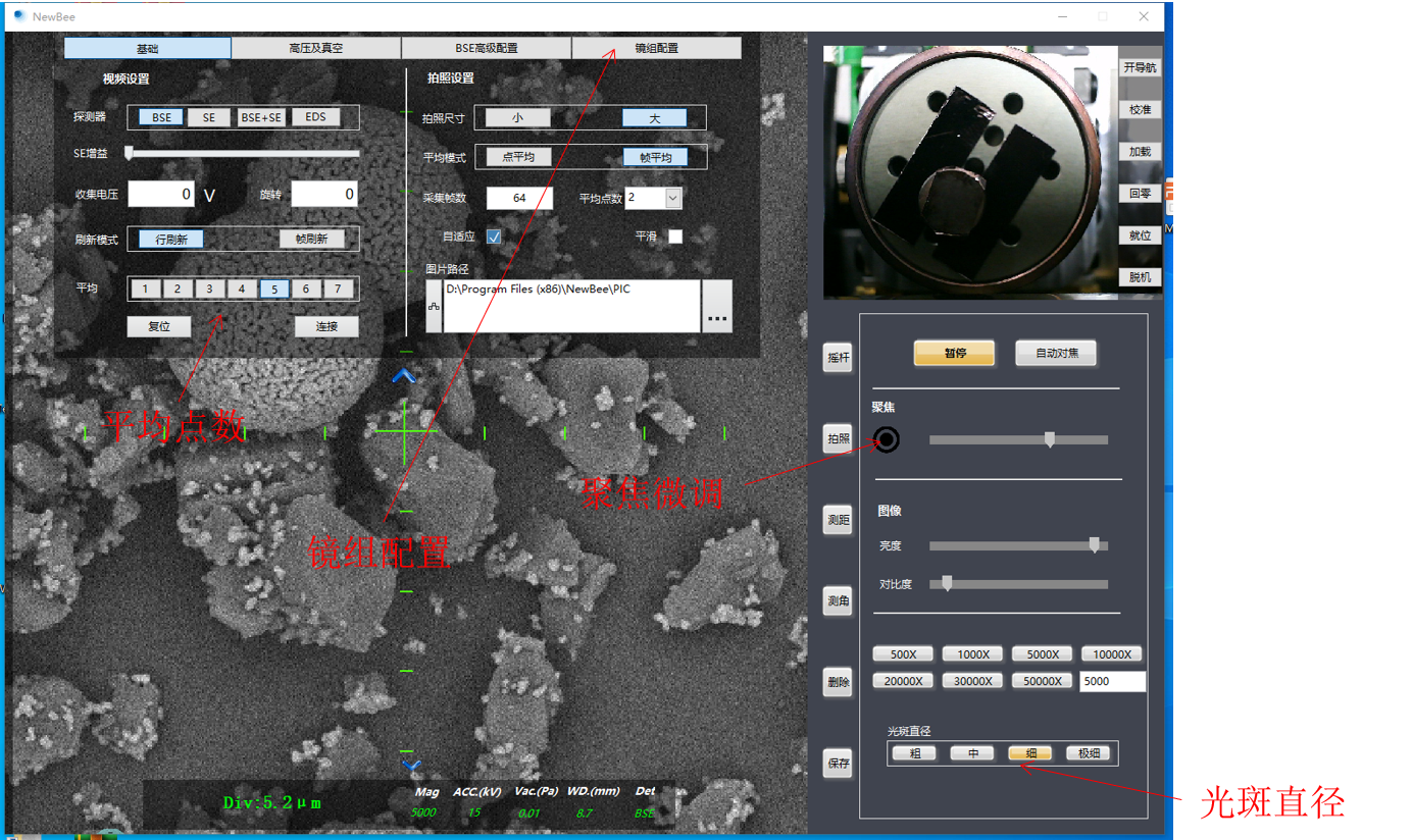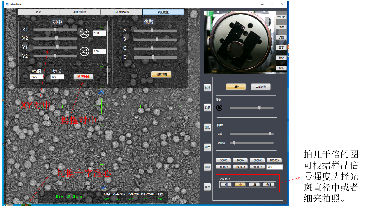 3、低倍數下有了較為清晰圖像后。將倍數放大至大于要拍攝倍數后(比如要拍攝1000倍,放大至5000或10000),將"平均"點數切換至5,然后將光標放至"聚焦微調"圓鈕上,緩慢滾動滾輪,調整至圖像清晰位置。然后切換至"鏡組配置",依次調整四個"消像散"條,至圖像清晰為止。