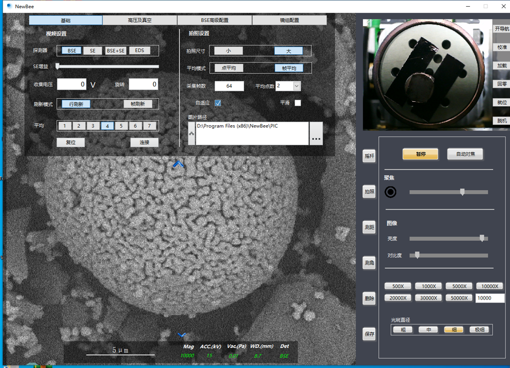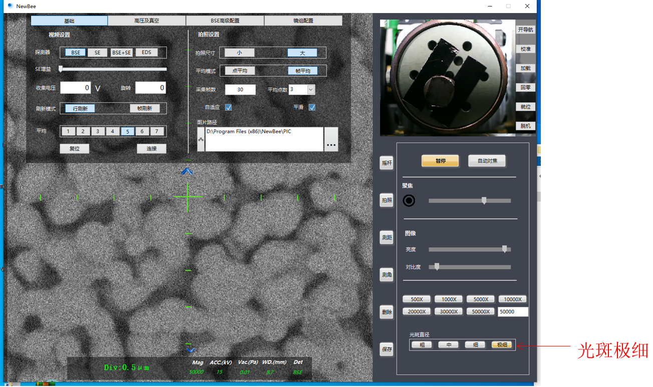 2、按照需要設定電壓值。并將"光斑直徑"調整至"粗"或者"中",勾選"自適應"按鈕,調整"亮度""對比度",至出現較為明亮的圖像。后粗調"聚焦"條,至顯示較為清晰的圖像,然后將樣品臺移動到想要拍照的樣品上。