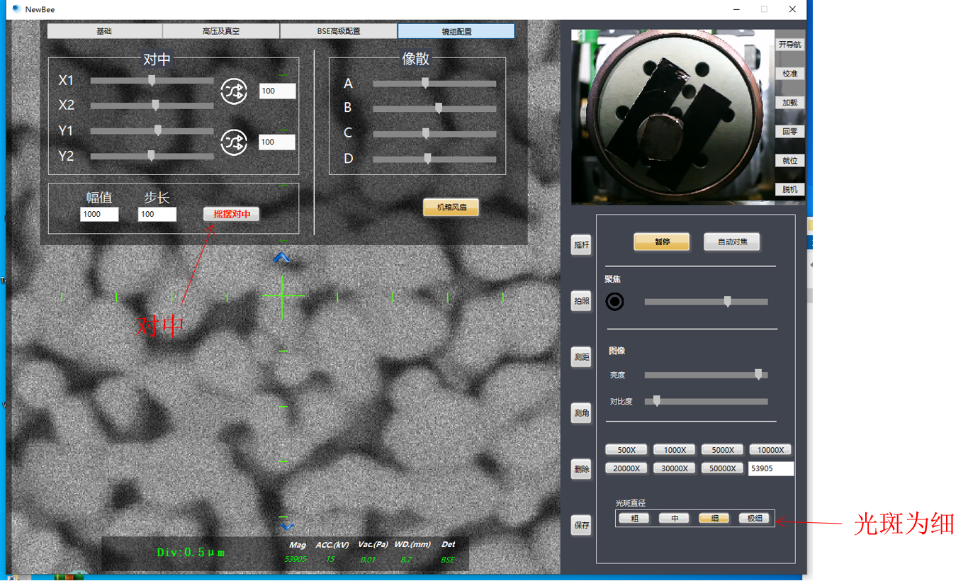 將光斑直徑保持為細,開啟十字準心,調焦至能看到所需拍攝的細節后,開啟搖擺對中,調節對中條,至準心與圖像相對位置同心縮放。而后調節像散至圖像至圖像清晰處(此步驟時可將基礎欄中視頻設置的平均點數調整為4,以便得到清晰圖像)。