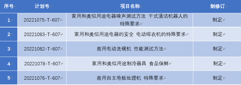 2022年12月,國家標準化管理委員會發布關于下達2022年第三批、第四批推薦性國家標準計劃及相關標準外文版計劃的通知(國標委發(2022)39號、國標委發(2022)51號),《家用和類似用途電器噪聲測試方法 干式清潔機器人的特殊要求》(計劃號:20221075-T-607)等家電領域推薦性國家標準計劃項目獲得批準,具體如下。