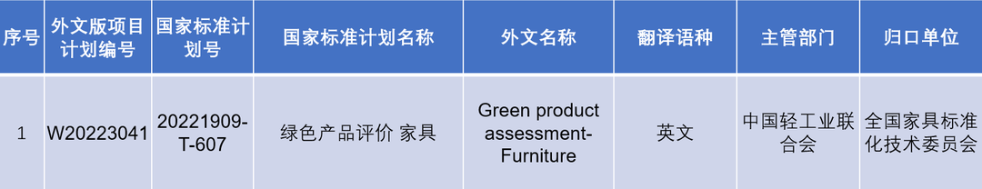 近日,國家標(biāo)準(zhǔn)化管理委員會發(fā)布關(guān)于下達(dá)2022年第四批推薦性國家標(biāo)準(zhǔn)計(jì)劃及相關(guān)標(biāo)準(zhǔn)外文版計(jì)劃的通知(國標(biāo)委發(fā)【2022】51號)。本批推薦性國家標(biāo)準(zhǔn)計(jì)劃共計(jì)389項(xiàng),其中包括《保溫材料 壓縮蠕變的測定》《日用香精中十三種限用香料的測定-氣相色譜-質(zhì)譜法》等22項(xiàng)輕工領(lǐng)域推薦性國家標(biāo)準(zhǔn)。本批推薦性國家標(biāo)準(zhǔn)同步下達(dá)英文版計(jì)劃共計(jì)50項(xiàng),其中包括《綠色產(chǎn)品評價(jià) 家具》輕工領(lǐng)域國家標(biāo)準(zhǔn)外文版,具體如下。