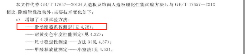 據了解,此次GB/T 17657-2022《人造板及飾面人造板理化性能試驗方法》新國標對比舊標準,其中增加了對人造板滑動摩擦系數的測試項目。
