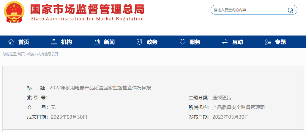 2022年,市場監(jiān)管總局組織家用電器產(chǎn)品質(zhì)量國家監(jiān)督抽查。現(xiàn)將抽查情況通報如下: