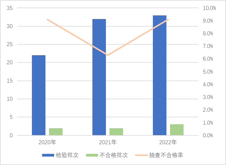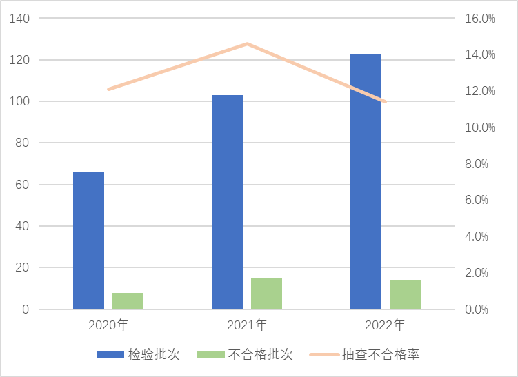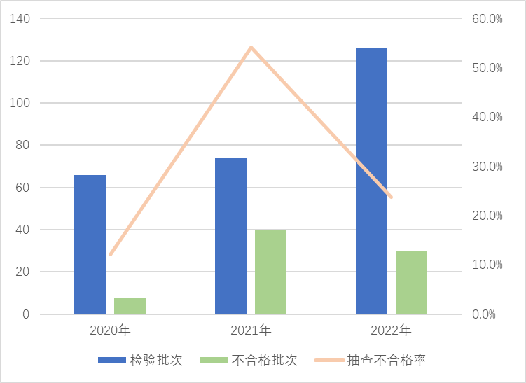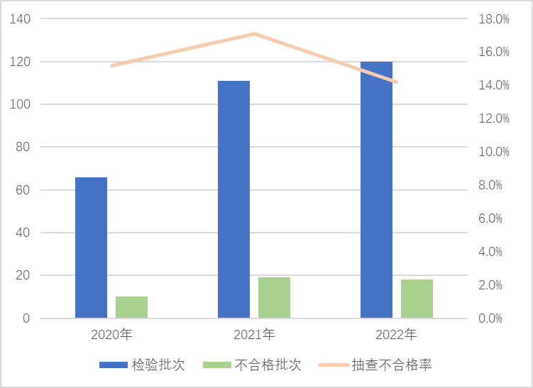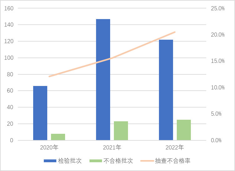本次在流通領(lǐng)域進行抽查,覆蓋11個省(區(qū)、市)121家企業(yè)生產(chǎn)的122批次產(chǎn)品,發(fā)現(xiàn)25批次產(chǎn)品不合格,抽查不合格率為20.5%,較上次抽查上升4.9個百分點。該產(chǎn)品近3年抽查不合格率分別為12.1%、15.6%、20.5%。