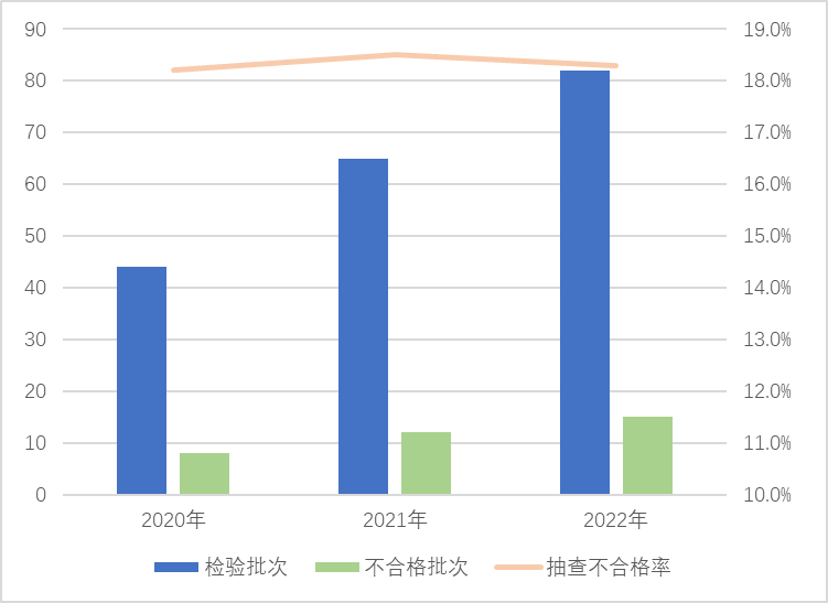 本次抽查5個省80家企業(yè)生產(chǎn)的82批次產(chǎn)品,發(fā)現(xiàn)15批次產(chǎn)品不合格,抽查不合格率為18.3%,較上次抽查下降0.2個百分點。該產(chǎn)品近3年抽查不合格率分別為18.2%、18.5%、18.3%。