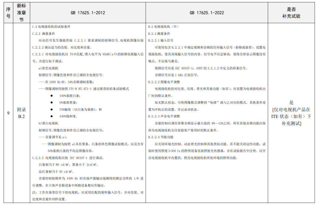 新標準更改了電視接收機的試驗條件,更加適合于當下電視機的性能參數的配置,更改內容主要體現在亮度調節、音量調節、節能功能等方面。需要注意的是,本次標準換版無需針對電視接收機功能對產品進行補充測試,僅需對電視機產品在ITE狀態(如有)下補充測試。