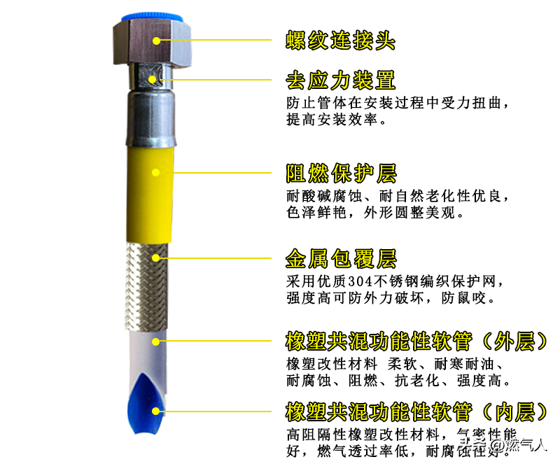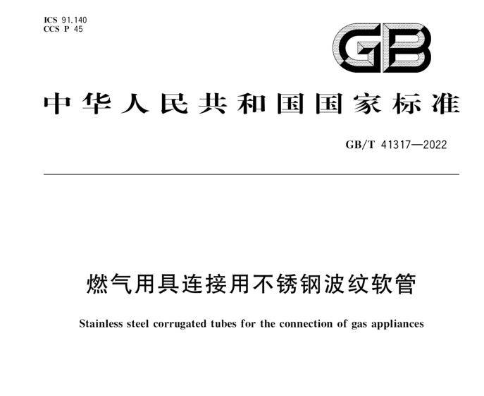 為保障人民群眾用氣安全,遏制燃氣事故發生,GB/T 41317-2022《燃氣用具連接用不銹鋼波紋軟管》正式批準發布,自2022年10月1日起實施。燃氣專用連接軟管兩端需有螺紋接頭。