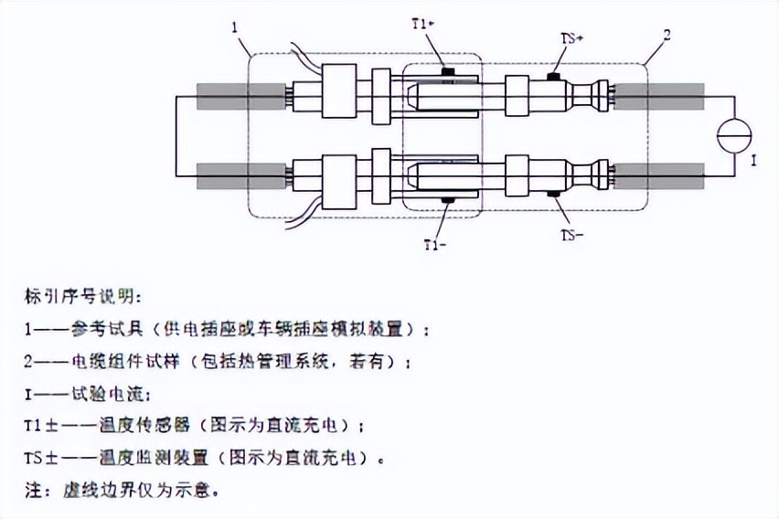 22、配置直流車輛插頭(250A)、交流車輛插頭(32A 和 63A)參考試具各一套,配 K 型熱電偶,線徑不大于 0.3mm,配端子或端頭加熱單元,總加熱功率不小于 50W,熱電偶和加熱單元安裝位置參考圖 17 和圖 18;