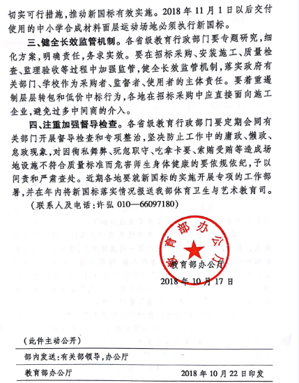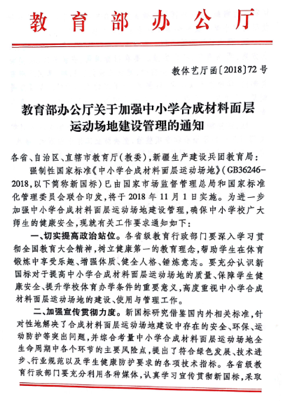 強(qiáng)制性國家標(biāo)準(zhǔn)GB36246-2018《中小學(xué)合成材料面層運動場地》(GB36246-2018,以下簡稱新國標(biāo))已由國家市場監(jiān)督管理總局和國家標(biāo)準(zhǔn)化管理委員會聯(lián)合印發(fā),將于2018年11月1日實施。為進(jìn)一步加強(qiáng)中小學(xué)合成材料面層運動場地建設(shè)管理,確保中小學(xué)校廣大師生的健康安全,現(xiàn)就有關(guān)工作要求通知如下: