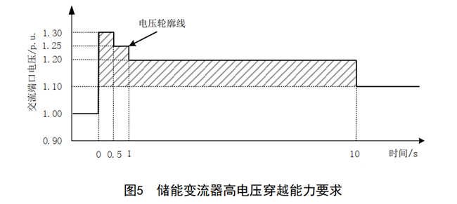 對于“高電壓穿越”,A1類、A2類、B1類和B2類儲能變流器交流端口電壓在圖5所示的電壓輪廓線及以下的區域內時,儲能變流器應不脫網連續運行。