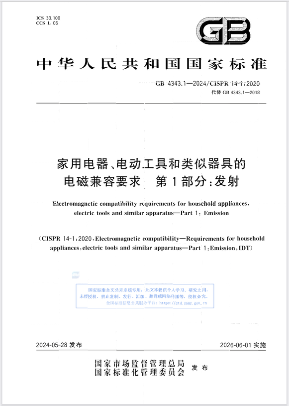 根據國家市場監督管理總局(國家標準化管理委員會)2024年第10號國家標準公告,GB 4343.1-2024《家用電器、電動工具和類似器具的電磁兼容要求 第1部分:發射》已批準發布,新標準將于2026年6月1日正式實施,替代GB 4343.1-2018《家用電器、電動工具和類似器具的電磁兼容要求 第1部分:發射》。