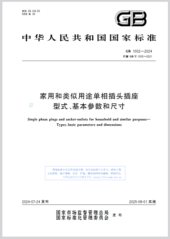 根據(jù)2024年第16號國家標準公告,GB 1002-2024《家用和類似用途單相插頭插座 型式、基本參數(shù)和尺寸》已批準發(fā)布,新標準將于2025年8月1日起實施,代替GB/T 1002-2021 《家用和類似用途單相插頭插座 型式、基本參數(shù)和尺寸》。
