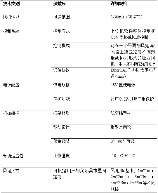 本裝置適用于民用輕小型旋翼類無人機(起飛重量在 0.25 kg~150 kg之間)系統抗風性能試驗,可模擬不同的風速狀態、不同風速陣列下的動態流體風場,以研究在不同的復雜風速、湍流度條件下的飛行器的飛行狀態。