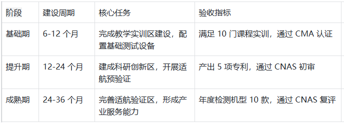 在基礎期,建設的重點是搭建教學實訓區,為學生提供一個良好的實踐學習環境。配置基礎測試設備,如無人機飛行模擬器、基礎測試儀器等,滿足《無人機飛行原理與實踐》《無人機組裝與調試》等 10 門課程的實訓需求。同時,積極申請 CMA 認證,建立完善的質量管理體系,確保實驗室的測試數據準確可靠,為后續的發展奠定堅實的基礎。